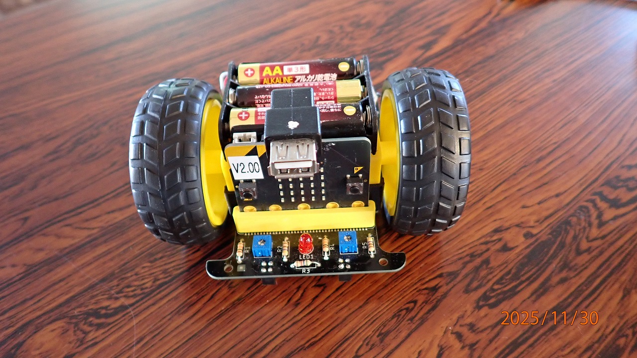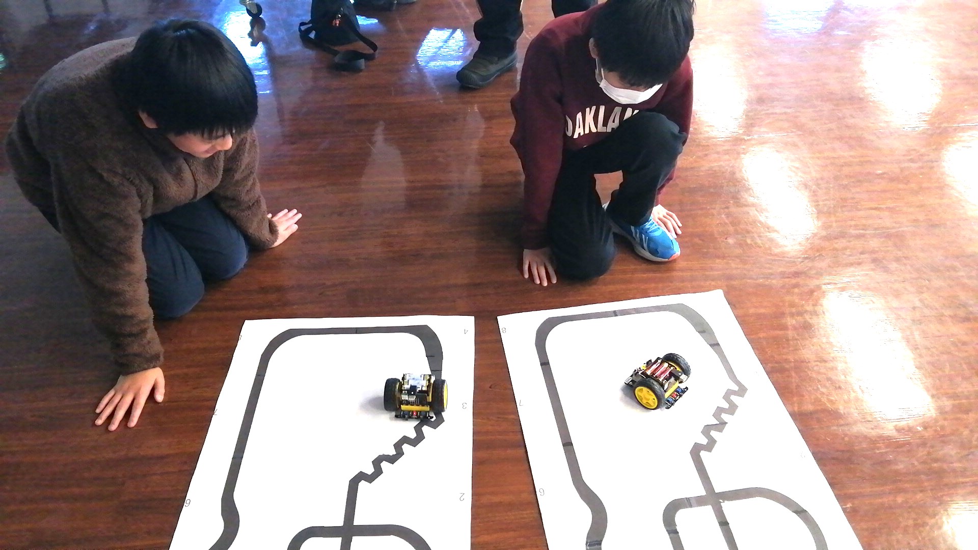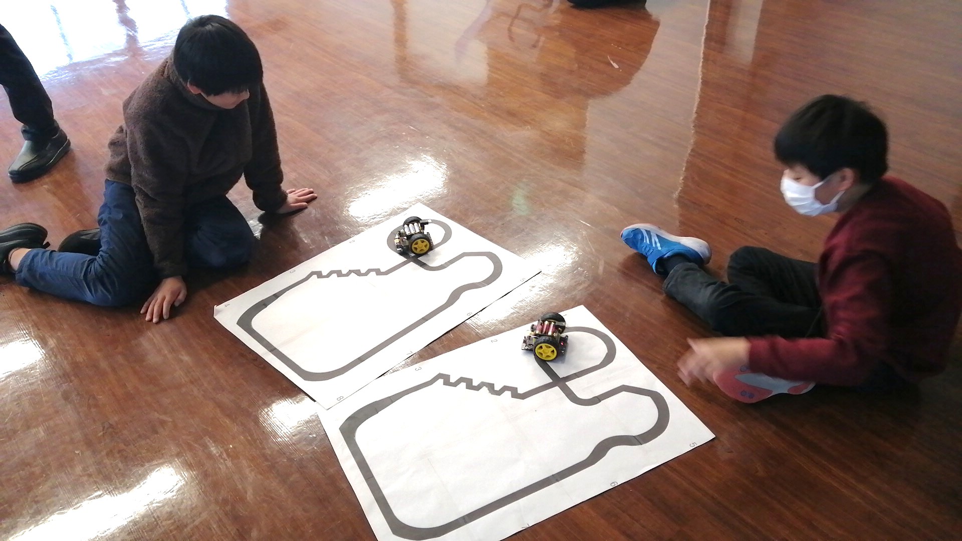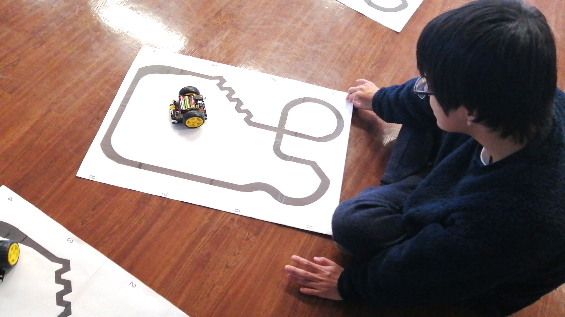 今回は、簡単なキーボード入力で、白い紙に書いた黒い線のコースに色々と走らせる実習でした。